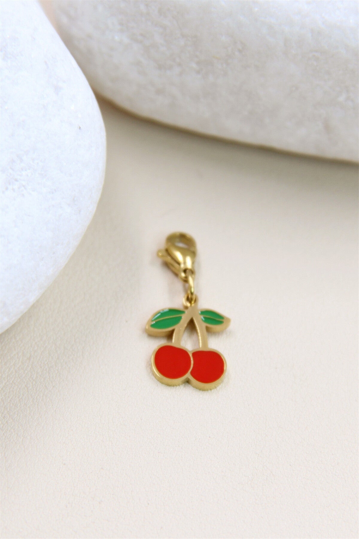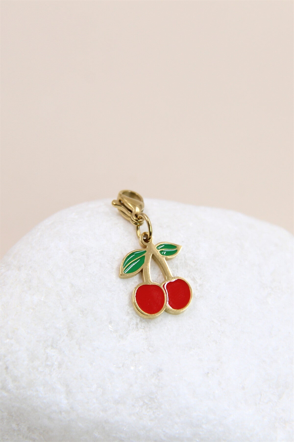 Ce pendentif charm en forme de cerises rouges avec des feuilles vertes, entouré d'une bordure dorée, est un véritable bijou de fantaisie. Fabriqué en acier inoxydable, il offre une finition lisse et brillante.