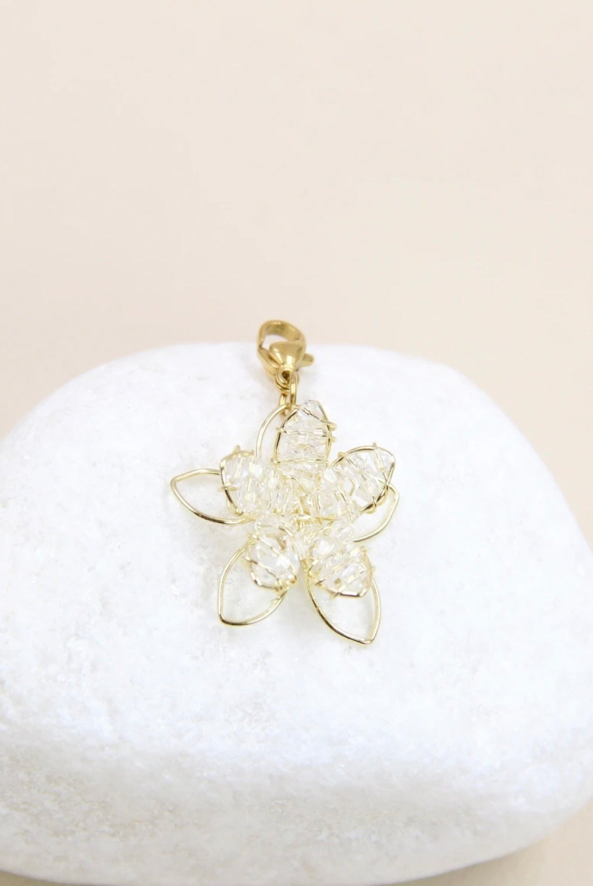Ce pendentif charm en forme de fleur, fabriqué en perles transparentes et fils dorés, est un véritable bijou de délicatesse.