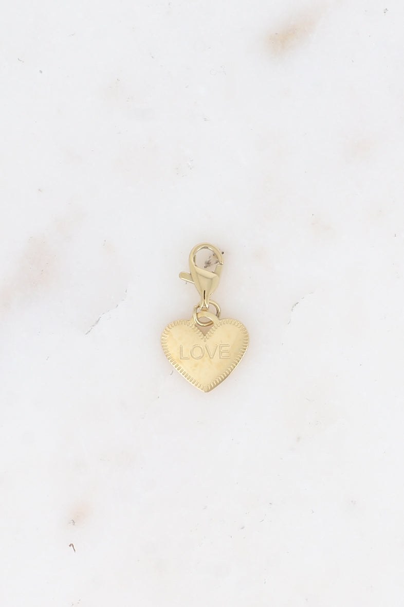 Pampille en forme de coeur aux contours striés et orné d'un mot "LOVE" gravé.
